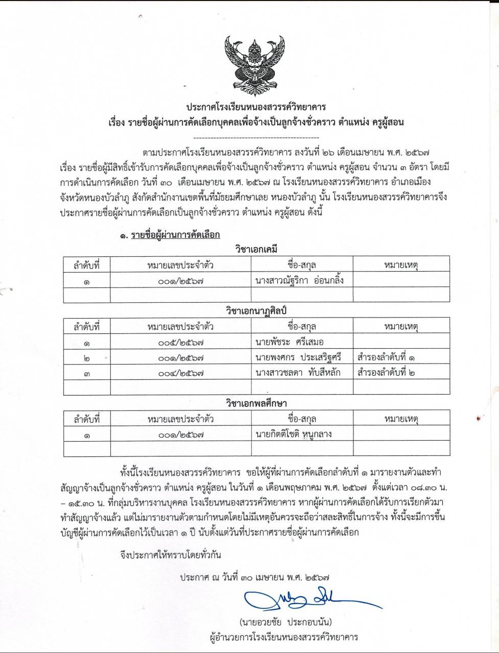 ประกาศโรงเรียนหนองสวรรค์วิทยาคาร เรื่อง รายชื่อผู้ผ่านการคัดเลือกบุคคลเพื่อจ้างเป็นลูกจ้างชั่วคราว ตำแหน่ง ครูผู้สอน
