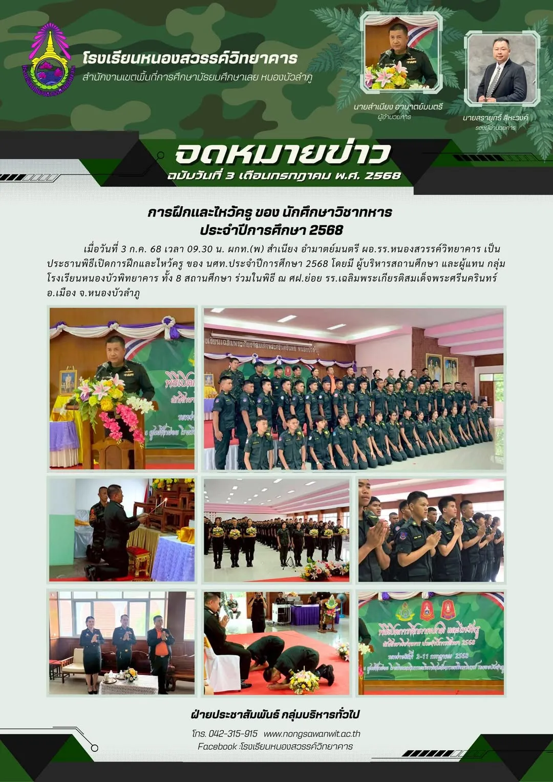 วันที่ 3 ก.ค. 68 เวลา 09.30 น. ผกท.(พ) สำเนียง อำมาตย์มนตรี ผอ.รร.หนองสวรรค์วิทยาคาร เป็นประธานพิธีเปิดการฝึกและไหว้ครู ของ นศท.ประจำปีการศึกษา 2568 โดยมีผู้บริหารสถานศึกษา และผู้แทน กลุ่มโรงเรียนหนองบัวพิทยาคาร ทั้ง 8 สถานศึกษา ร่วมในพิธี ณ ศฝ.ย่อย รร.เฉลิมพระเกียรติสมเด็จพระศรีนครินทร์อ.เมือง จ.หนองบัวลำภู