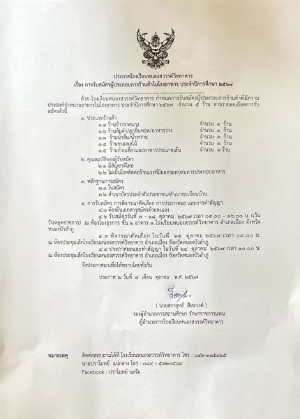 ประกาศโรงเรียนหนองสวรรค์วิทยาคาร เรื่อง การรับสมัครผู้ประกอบการร้านค้าในโรงอาหาร ประจําปีการศึกษา ๒๕๖๗