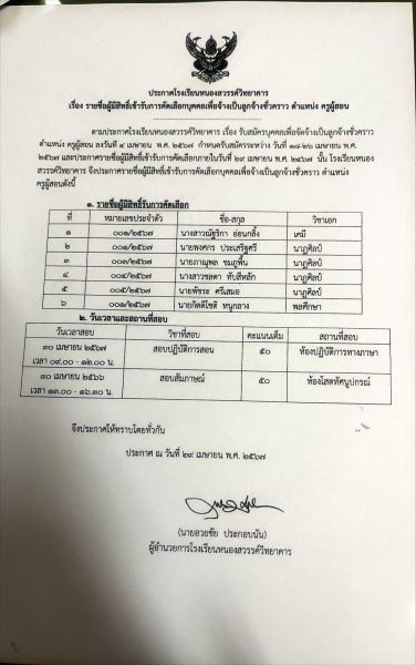 รายชื่อผู้มีสิทธิ์เข้ารับการคัดเลือกบุคคลเพื่อจ้างเป็นลูกจ้างชั่วคราว ตำแหน่ง ครูผู้สอน